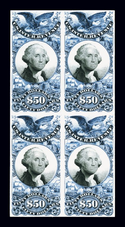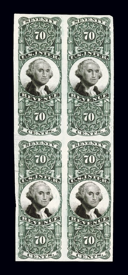 1064 Pbl R131P4 image#R131P4, $50.00 Blue and black, plate proof on card, choice block of four, with large to extra-large margins all around, sharp impressions and lovely colors on this high value, clean white card, extremely fine and scarce block. (Image) $625.00