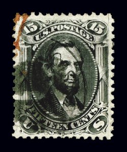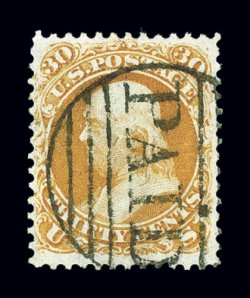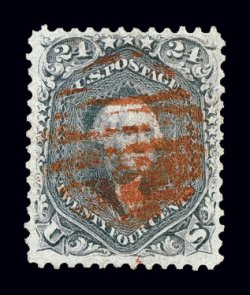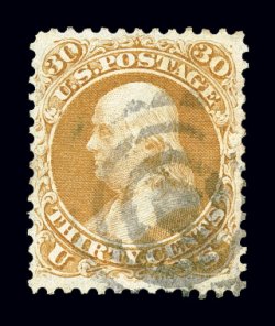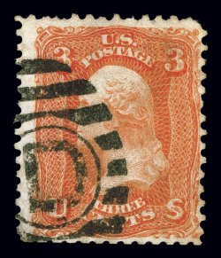 134 O 74 image#74, 3c Scarlet, an incredibly rare used example of this trial printing with bold "D" in oval of bars cancel, bright fresh color and clear sharp impression, quite well centered for this, trace of soiling at top right, otherwise very fine.The Three Cent Scarlet, whether mint or used, has always been an exceptionally scarce stamp. Usually it is found without cancel or with four parallel pen strokes thought to be invalidating cancels similar to a specimen overprint, and cancelled thus they are listed as used in Scott. It is well known that these stamps were not regularly used during the normal 1860's of their issuance. However there were a very few stamps that were actually used at a later time. The "D" grid cancel is the killer portion of a duplex from New York's station D post office. It is believed that as mint examples of this stamp were released, John W. Scott, publisher of the Scott Catalog, obtained some copies and actually used them apparently to validate his claim that they were proper for postage.The used stamp offered here is in the rarest of the three states that this stamp is found. It is believed that there are only five examples with this handstamp cancel, with an additional example outside private hands in the Tapling Collection. Of these, most have faults of varying degrees, the example offered here being in far better condition than most. An excellent opportunity to acquire an extraordinarily rare used stamp for the collector who is striving for completeness in his used collection. Accompanied by a 1994 PF certificate; ex-Twigg-Smith, "Ganymede". (Image) Est. 7,500-10,000