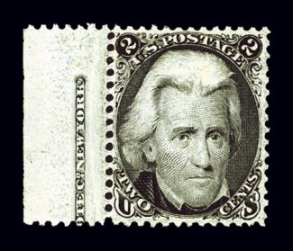 133 og 73 image#73, 2c Black, an outstanding left sheet-margin partial imprint single, being wonderfully fresh, with sumptuously rich color and a deeply etched impression, plus it is extraordinarily well centered, full clean o.g. with just a faint trace of hinging, extremely fine; a rare stamp in this impressive quality; 1996 PSE certificate. (Image) $375.00
