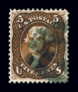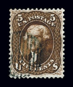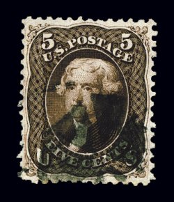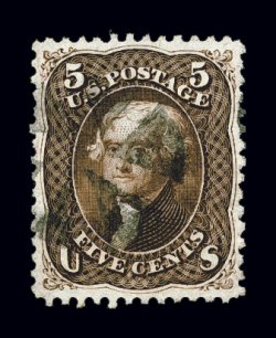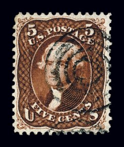 135 O 75 image#75, 5c Red brown, a gem used example that is in a condition few used copies of the 1862 Five Cent Red Brown can match, being wonderfully well centered amid lavishly large margins that are most uncommon to this value, with no portion of the stamp's design being impinged by its perforations, impressive deep rich color and a detailed impression on bright paper, attractively postmarked with a lightly struck target in black, extremely fine; a true condition rarity in this outstanding quality; 1988 PF certificate; ex-"Ganymede". (Image) $525.00