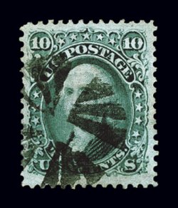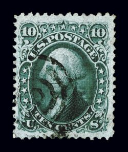 175 O 96 var. image#96 var., 10c Green, "F" grill, handsome used example in a distinctive green shade, quite well centered within large margins, deep luxuriant color, light central strike of a quartered cork postmark, extremely fine; 1996 PF certificate specifically identifying this as the green shade (which is a Scott listed color). (Image) $250.00