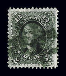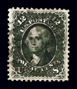 166 O 90 image#90, 12c Black, "E" grill, an exceptional quality used single, being incredibly well centered amid extravagantly large margins which are seldom encountered, plus its color is especially deep and its impression strong on fresh clean paper, central leaf cancel in black, extremely fine and pretty; a terribly challenging stamp to find used in this gem quality; 2000 PF certificate; ex-"Ganymede". (Image) $400.00