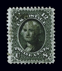 176 O 97 image#97, 12c Black, "F" grill, an incredibly choice used example which features extravagantly large margins which are most uncharacteristic of this stamp, plus it is extraordinarily well centered within these impressive borders, strong color and a clean impression on bright paper, light central strike of a "crossroads" cancel, extremely fine; a terribly challenging stamp to find in this gem used condition; 1988 PF certificate. (Image) $275.00