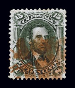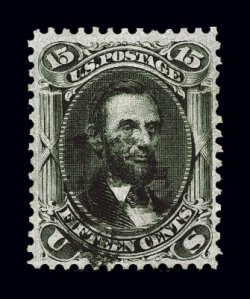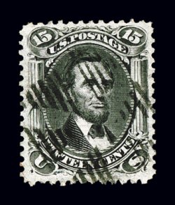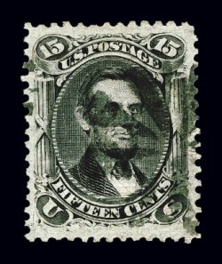 168 O 91 image#91, 15c Black, "E" grill, a magnificent quality used example of this impossibly difficult value, as virtually every known copy, whether mint or used, is poorly centered and with no margins on at least one side, this stunning used example is the rare exception to the rule, as it boasts outstanding centering amid extravagantly large margins that are unheard of on this, additionally its color is deep and intense with a razor-sharp impression on brilliantly white paper, easily identifiable grill impression, neatly cancelled with a black sunburst, an extremely fine gem; the epitome of a condition rarity; 2001 PF certificate; ex-"Ganymede". (Image) $675.00
