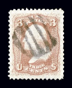 172 O 94 image#94, 3c Red, "F" grill, a matchless used example, possessing the most massive and perfectly balanced margins we have ever encountered on this stamp, or on any other grilled stamp for that matter, warm rich color, central strike of a grid cancel, extremely fine; a superb jumbo for the used collector who seeks out stamps in only the finest attainable condition; 1988 PF certificate. (Image) $10.00
