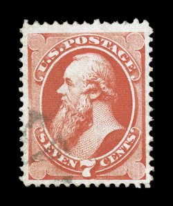 exceptionally bright and fresh, well centered within large margins, light an#138 var., 7c Vermilion with quadruple split grill, a handsome used example of this rare and undercataloged variety, with easily identifiable grills in all four corners, exceptionally bright and fresh, well centered within large margins, light and unobtrusive cancel confined to the bottom left corner, very fine and quite choice; 2005 PF certificate. (Image) $950.00