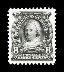 perfectly centered within extravagantly large margins, spectacular color an#306, 8c Violey black, a breathtakingly beautiful mint single in the finest attainable quality, as every aspect of this stamp is extraordinary, including being absolutely perfectly centered within extravagantly large margins, spectacular color and impression that are incredibly deep and prooflike on immaculate white paper, pristine o.g., n.h., a superb stamp for the finest collection of mint stamps; 2007 PSE certificate (Superb 98; SMQ $4,300.00); this is the only example to grade 98 in the PSE population report, with just one grading slightly higher (98J). (Image) $110.00