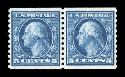 certificate (XF-Superb 95 SMQ $600.00).#458, 5c Blue rotary coil, perf. 10 vert., choice quality mint pair, excellent centering, lovely rich color and a strong impression, o.g., n.h., extremely fine; 2007 PSE certificate (XF-Superb 95; SMQ $600.00). (Image) $160.00