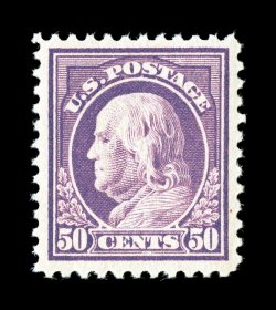 on pristine white paper, o.g., n.h., superb while premium examples#517, 50c Red violet, a remarkably choice mint example, being flawlessly centered amid extravagantly large margins, marvelously bright and fresh, with strong color and impression on pristine white paper, o.g., n.h., superb; while premium examples of #517 are available, few can compare to the overall exceptional qualities of this gem; 2001 PF certificate and a 2007 PSE certificate (Superb 98; SMQ $3,100.00). (Image) $150.00
