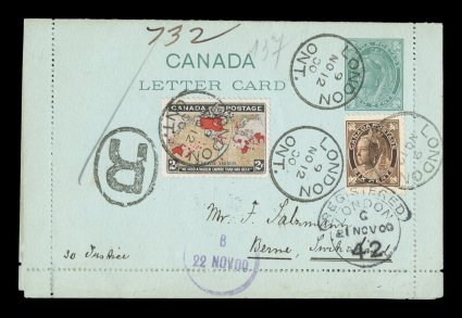 card (Unitrade UL6) to Switzerland, plus a 6c Brown Maple Leaf1898 2c Black, blue and carmine Imperial Penny Postage, attractive single with oceans oxidized to a uniform brown of the "Muddy water" effect, tied to a gorgeous 2c Green letter card (Unitrade #UL6) to Switzerland, plus a 6c Brown "Maple Leaf" (Unitrade #71), all tied by clear "London/Ont./NO 12 00" c.d.s., London (England) transits on the front including a registry c.d.s. also tying the 6c value, backstamped Bern, complete edges to the letter card with a few perf. separations, very fine; 2c Map stamps on letter cards are exceptionally rare, this example being particularly so with the additional adhesives making up the single U.P.U. registry rate to Switzerland ex-Winmill and illustrated on page 17 of his book (Unitrade #86). (Image) Est. $400-500