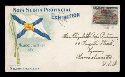 illustrated cover in colors by circular grid cancel, indistinct Nova Sc1898 2c Black, blue and carmine Imperial Penny Postage, single with uniform "muddy water" effect in a rich brown, tied to gorgeous 1899 Nova Scotia Provincial Exhibition flag illustrated cover in colors by circular grid cancel, indistinct Nova Scotia c.d.s. at left, backstamped Lynn, Mass., trivial edge tear and wrinkles not affecting the attractiveness of this very fine and scarce cover; illustrated on page 102 of Winmill; ex-Bain (Unitrade #86) (Image) Est. $200-300