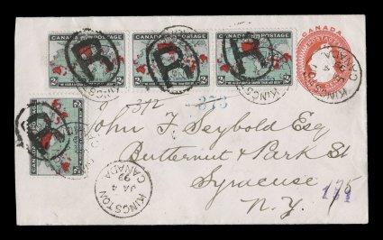KingstonCanadaJA 4 99 c.d.s. and R in oval handstamps, registered to the Unit1898 2c Black, deep blue and carmine Imperial Penny Postage, very attractive horizontal strip of three and a single tied to 3c Red postal entire (Unitrade #U8) by "Kingston/Canada/JA 4 99" c.d.s. and "R" in oval handstamps, registered to the United States with Buffalo, N.Y. transit and backstamped Syracuse, N.Y., choice very fine and handsome cover; this cover, posted just after the rate reduction from 3c to 2c, is an extremely rare triple rate cover paying 6c postage and 5c registry fee and may be the only known registered cover with sole 2c Map franking on a postal entire (Unitrade #86b). (Image) Est. $300-400