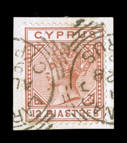fine and handsome (S.G. 37 £325).#25a 1893 12Pi Brown orange, Die B, choice used single of this scarce die, tied to small piece by portions of Larnaca squared circle cancels, bright color, well centered, very fine and handsome (S.G. #37; £325). (Image) $375.00
