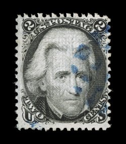 perforations clear the design and it is actually better centered than the vas#84, 2c Black, "D" grill, a particularly fresh used example of this rare grill, strong rich color and a highly detailed impression, while centered to the top right, the perforations clear the design and it is actually better centered than the vast majority of "D" grills, most of which have the perforations strongly cutting into the design, cancelled by a blue cancel, which is almost never encountered on this stamp, well defined grill, very fine; 2005 PF certificate. (Image) $5,000.00