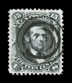 bright white paper, centrally struck target cancel, extremely fine#91, 15c Black, "E" grill, a most impressive used example, especially well centered within extraordinarily large margins which are rarely encountered on this stamp, fresh color on bright white paper, centrally struck target cancel, extremely fine; actually a very scarce stamp in this outstanding quality; 2007 PF certificate. (Image) $675.00