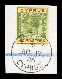 in all respects (S.G. 117 £180).#108, 1924 90Pi Green and red on yellow, an amazingly well centered single, tied to small piece of registered cover by well struck "Nicosia/Cyprus/AP 13 25" c.d.s., extremely fine in all respects (S.G. #117; £180). (Image) $200.00
