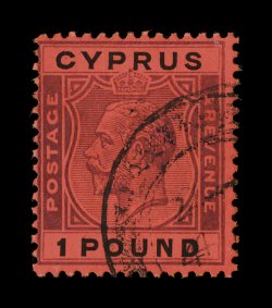 fine and exceedingly choice an exceptionally elusive stamp in premiu#88, 1923 £1 Violet and black on red, an unusually handsome single of this key high value, radiant colors, especially well centered, portion of light double-circle c.d.s., very fine and exceedingly choice; an exceptionally elusive stamp in premium used quality, being far scarcer used than mint; 1977 RPS certificate (S.G. #101; £2,000). (Image) $2,100.00