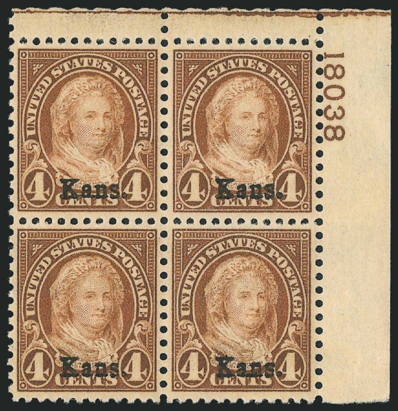 870 nhbl Image4c Kans. Ovpt. (662). Mint N.H. top right plate no. 18038 block of four, rich color and detailed impression, fresh and Extremely Fine, a beautiful plate block, with 2000 P.F. certificate (Image)