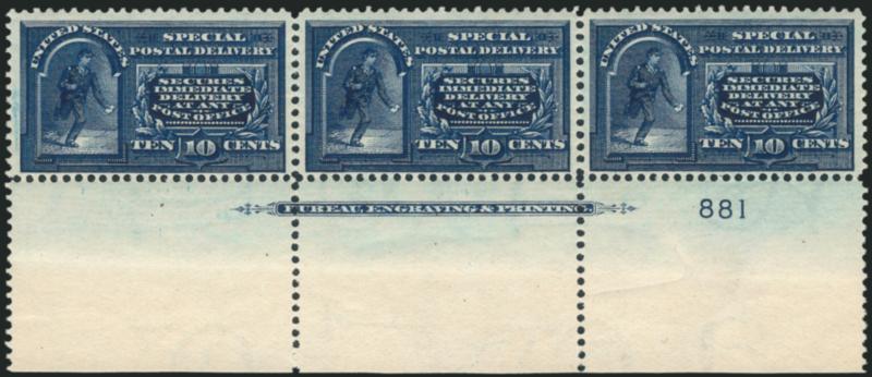909 nh Image10c Blue, Special Delivery (E5). Mint N.H. bottom imprint and plate no. 881 strip of three, deep rich color and proof-like impression Very Fine and choice, and attractive multiple, Scott Retail as singles (Image)