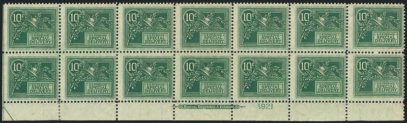912 nhbl Image10c Green, Special Delivery (E7). Mint N.H. bottom imprint and plate no. 4921 block of 14, natural s.e. at left with part arrow, top left stamp few small natural skips, Fine (Image)