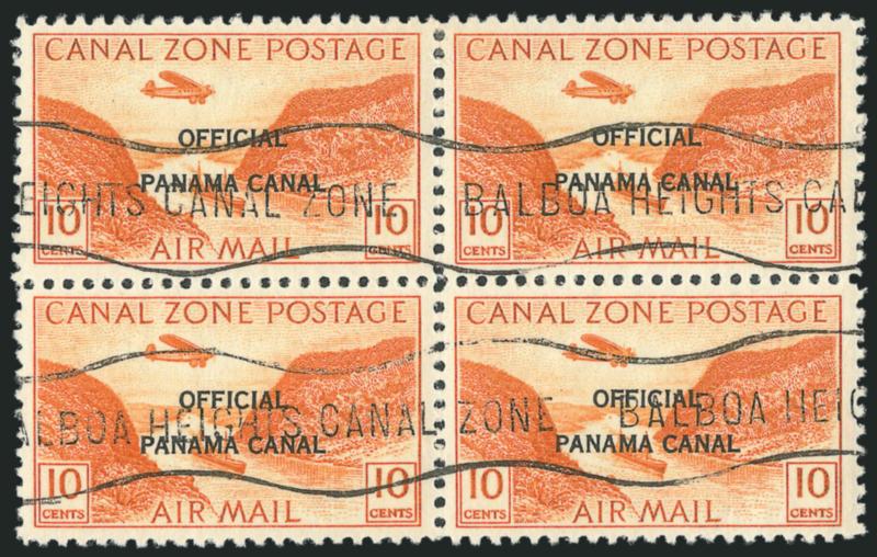 1042 bl Image1941, 5c-40c Air Post Officials, "Panama Canal" 17mm Long (CO8-CO12). Complete set in blocks of four, fresh colors, Balboa Heights roller cancels, 10c with choice centering and wide margins, Extremely Fine, 5c Fine, others Very Fine-Extremely Fine, a fresh and rare set of blocks with the Type II ovpts. (Image)