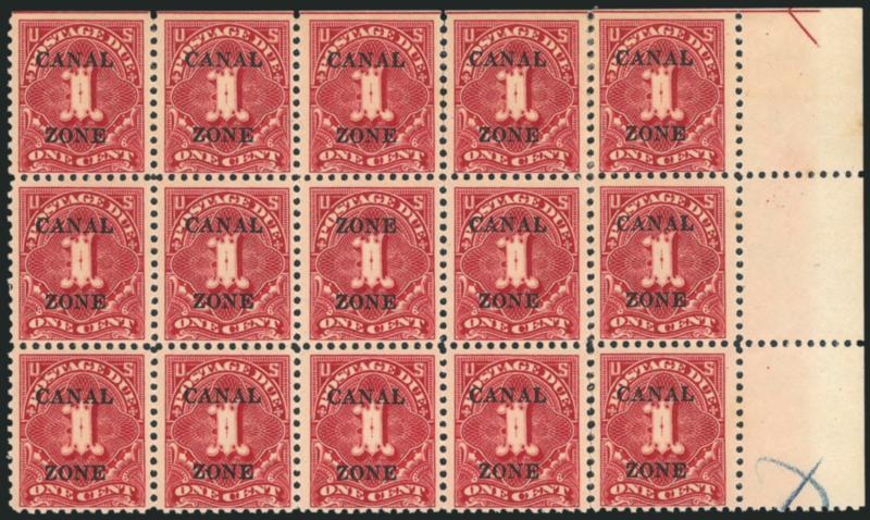 1046 ogbl Image1925, 1c Carmine Rose, Postage Due, "Zone Zone" Ovpt. (J18a). Block of eighteen with part arrow natural s.e. at top and selvage at right, the error is Pos. 18LR (pos. 8 in this multiple) and Mint N.H., tiny natural perf disc adherence on gum, six additional normal stamps also Mint N.H., some separations between 3rd and 4th vertical rows, Fine, only approximately 15 of the 75 printed are known -- the rest are lost to philately, with 2007 P.F. certificate (Image)