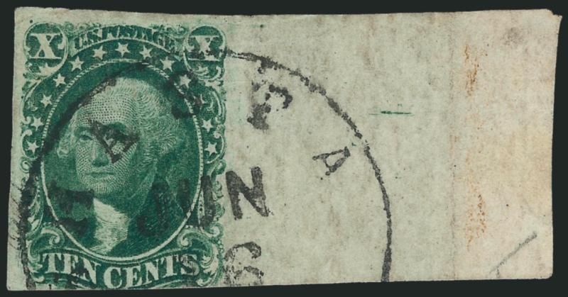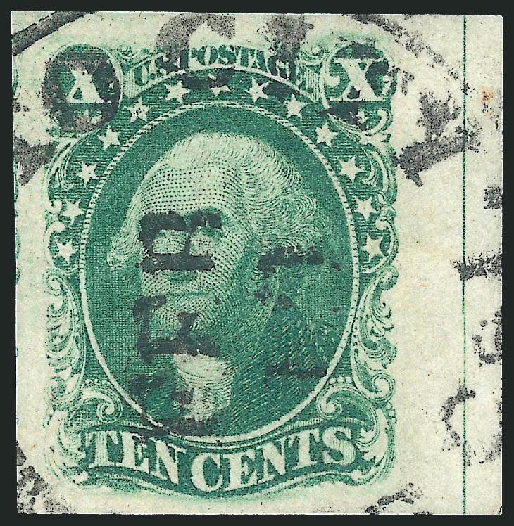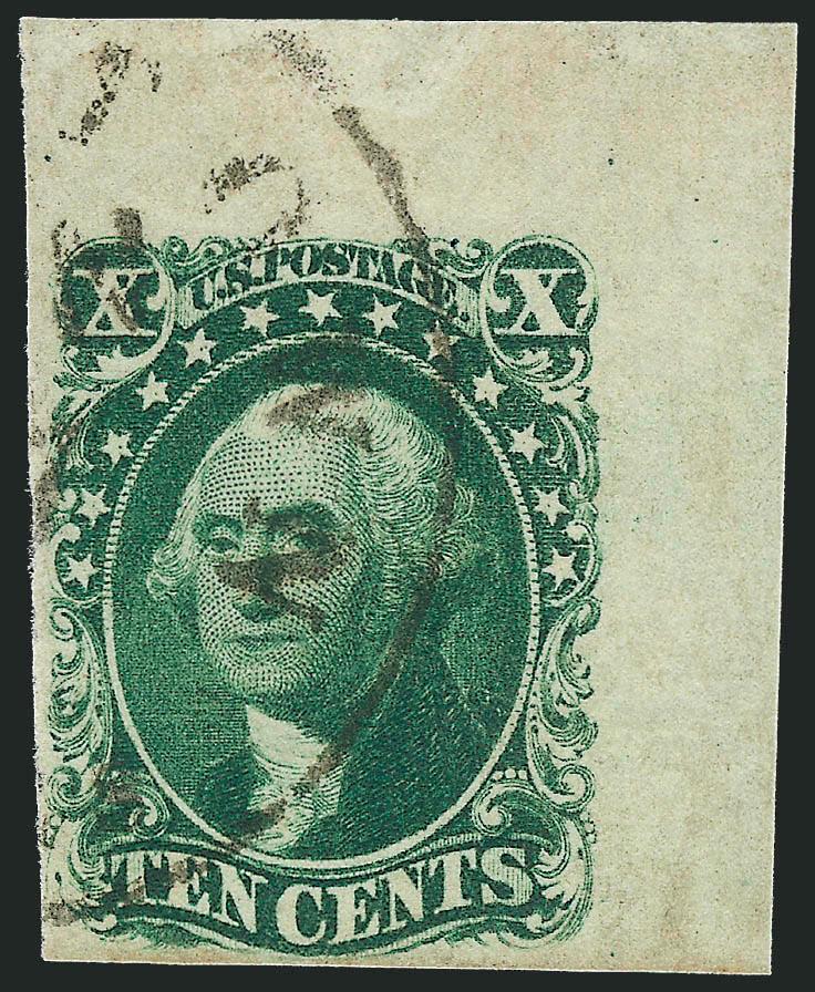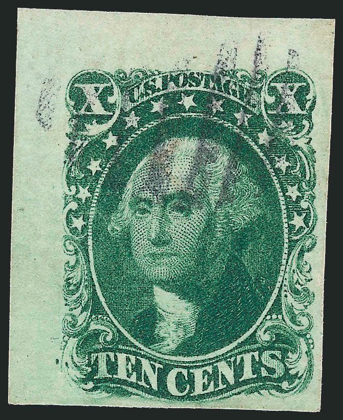 EXTREMELY FINE GEM. A SUPERB AND RARE CORNER-MARGIN COPY OF THE 1855 10-CENT TYPE I.