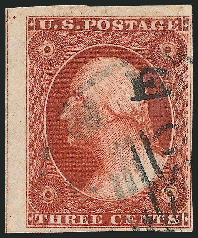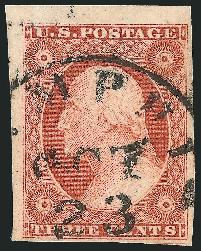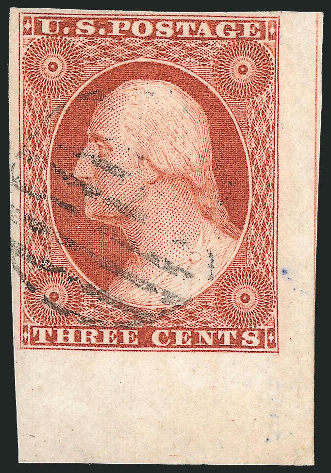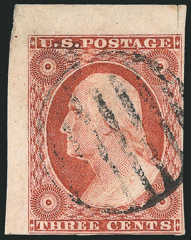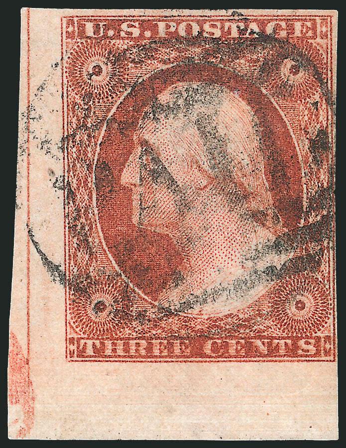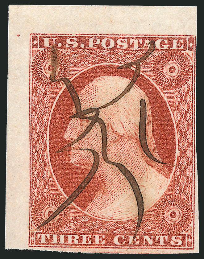 153   Image3c Orange Brown, Ty. II (10A). Position 1R0, huge margins to clear including top left corner sheet margins, intense shade and proof-like impression on bright paper, unusual manuscript cancel, trivial corner crease at top left entirely in margin is barely noticeable, Very Fine and choice position piece (Image)