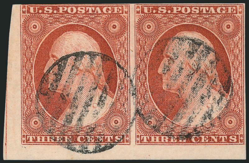155   Image3c Orange Brown, Ty. I (10). Positions 90/100R1E, vertical pair, huge margins to full including bottom right corner sheet margins, attractive bright color, bold strikes of grid cancel, Very Fine-Extremely Fine, the bottom stamp is a true Gem (Image)