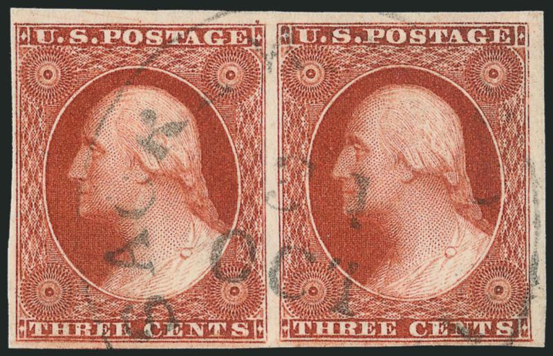 157   Image3c Orange Brown, Ty. II (10A). Positions 9-10R0, horizontal pair, huge margins to clear including trace of top right corner sheet margins, vibrant color as fresh as the day it was printed, light strike of Sacramento circular datestamp, Extremely Fine pair (Image)