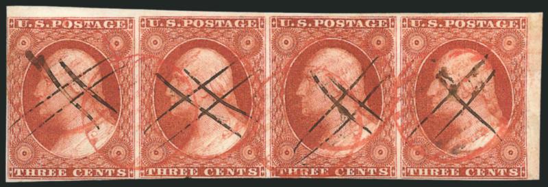 158   Image3c Orange Brown, Ty. II (10A). Positions 7-10L1i, horizontal strip of four, large margins to clear including part of top right corner sheet margins, intense shade, red grid cancels and also each with manuscript "#", small thin spot at top right mostly in margin, Fine-Very Fine appearance, scarce strip of four, Scott Retail as strip of three and single (Image)