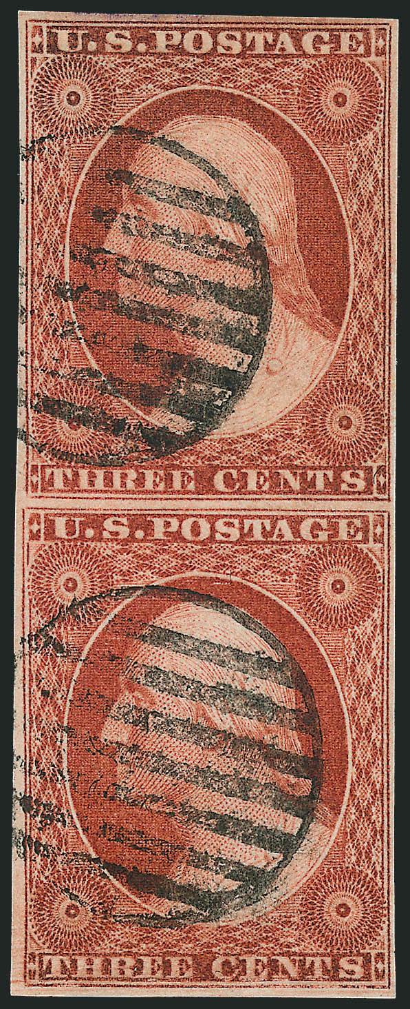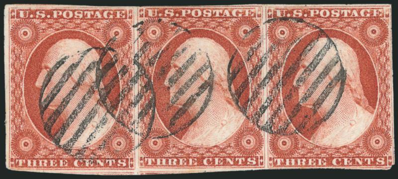 220   Image3c 1851-57 Issue, Used Multiples (10-10A, 11-11A, 26). No. 10 or 10A Orange Brown including strip of three from Plate 1i and two pairs, one from Plate 0, No. 11 or 11A including 45 pairs, nine strips of three, six strips of four, three strips of five and one strip of six, No. 26 block of eight, many multiples with attractive margins, range of shades, many plated, all with handstamp cancels including some colored, faults to be expected on some but overall Fine-Very Fine with many individual stamps Extremely Fine, a desirable and higher quality group than usually encountered with these issues, Scott Retail as singles, pairs and strips of three, with no premium for the larger multiples (Image)