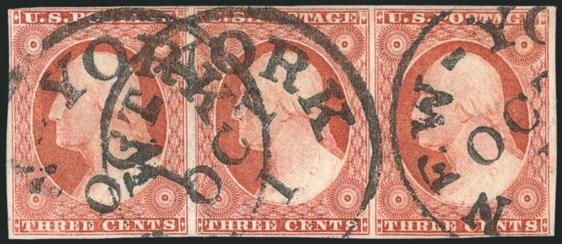 213   Image3c Orange Brown, Ty. II (10A). Positions 91-93R2E, horizontal strip of three, large margins to just in, bright color, bold strikes of New York circular datestamp, crease affects each stamp, Fine-Very Fine appearance (Image)