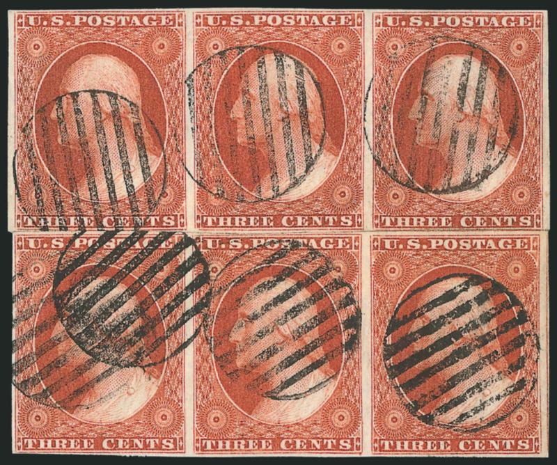 214   Image3c Orange Brown, Ty. II (10A). Two horizontal strips of three rejoined to form a block of six, rich color and detailed impression, small tear at bottom left, Fine-Very Fine appearance, ex Amonette, Scott Retail as two strips of three (Image)
