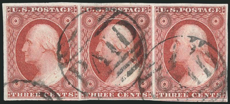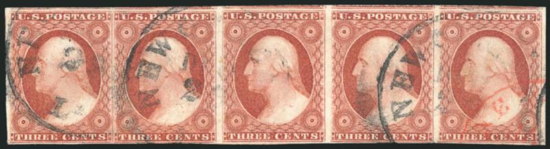 262   Image3c Brownish Carmine, Ty. I (11). Positions 85-89L4, horizontal strip of five, large margins to just clear at couple points at bottom, rich color, red and black New York datestamps, Fine-Very Fine, an attractive large multiple, ex Cohen, Scott Retail as strip of three and pair (Image)