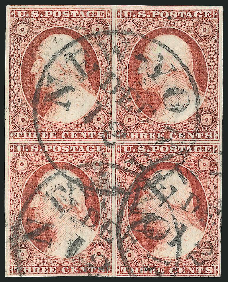 263 bl Image3c Brownish Carmine, Ty. II (11A). Positions 31-32/41-42R3, block of four, large even margins, intense shade and impression, bold New York circular datestamps, tiny corner crease at top right, Very Fine-Extremely Fine appearance (Image)