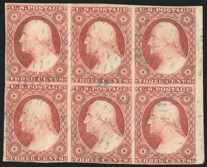 264 bl Image3c Brownish Carmine, Ty. II (11A var). Block of six, huge margins to just in at bottom center with right sheet margin, bright color, unusual blue grid cancels, slightly wrinkled, Very Fine appearance, with 1998 A.P.S. certificate, Scott Retail as block of four and pair (Image)