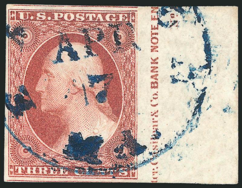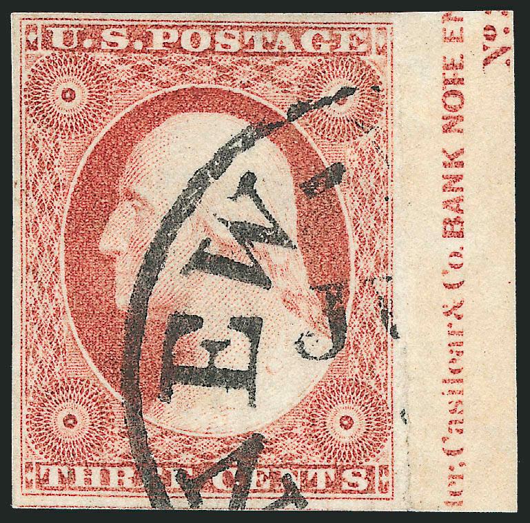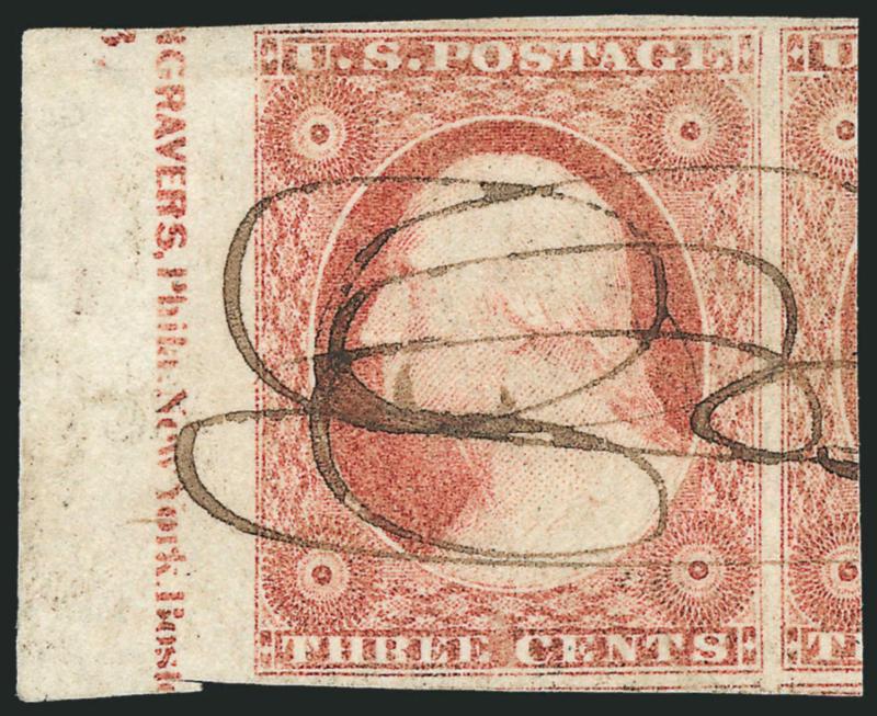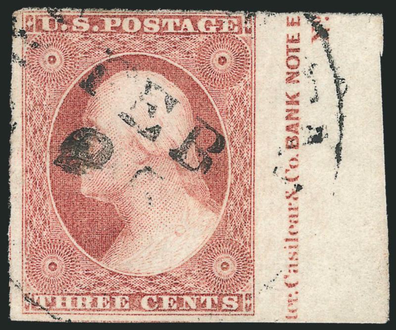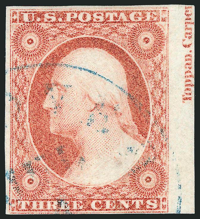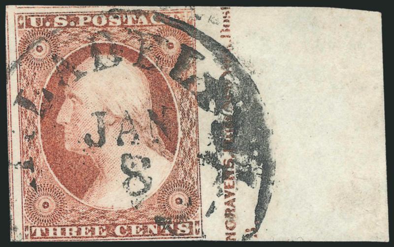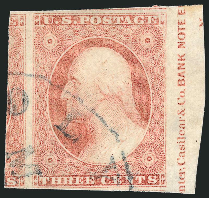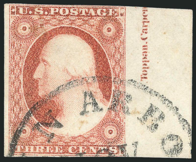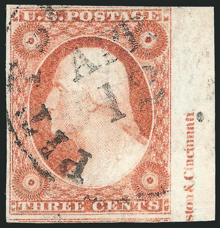 279   Image3c Dull Red, Ty. II (11A). Position 50R3, huge margins to just in including part imprint and "3" of plate no. in huge right sheet margin, rich color, bold Philadelphia circular datestamp, Very Fine, a scarce and desirable stamp with the plate number (Image)