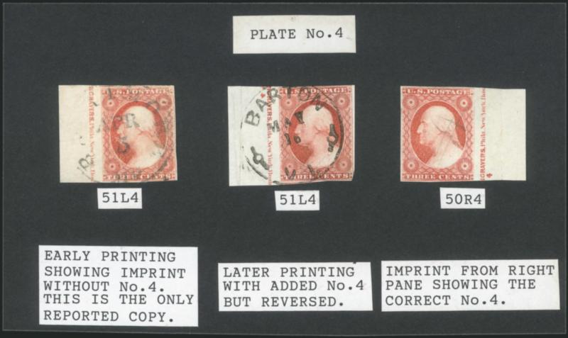 287   Image3c Dull Red, Ty. I (11). Three used singles from Plate 4, including two examples of Position 51L4 with one without plate no. and other with plate no. "4" reversed, third is Position 50R4 showing the correct orientation of the "4" of plate no., few flaws including first with bottom corner repaired, otherwise Fine-Very Fine, a wonderful study of the three different states of the plate number from Plate 4, ex Amonette (Image)