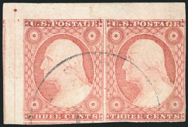 353   Image3c Dull Red, Ty. II (11A). Positions 1-2R1L, horizontal pair, huge margins to clear including top left corner straddle-pane margins and part of adjoining stamp at bottom left, radiant color, light strike of circular datestamp, Very Fine-Extremely Fine, a gorgeous pair, the left stamp is a Gem (Image)