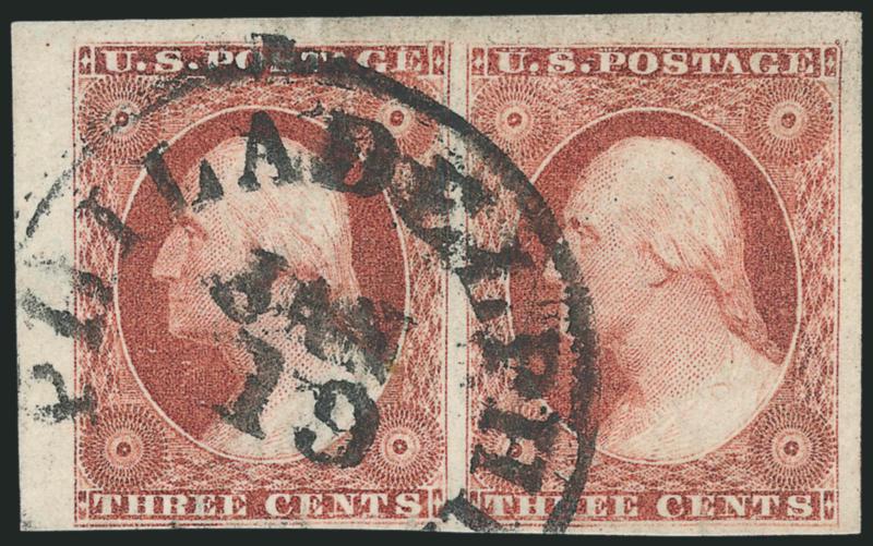 356   Image3c Dull Red, Ty. I (11). Horizontal pair, huge margins to clear including top left corner sheet margins, bright color, bold strike of Philadelphia circular datestamp, Very Fine-Extremely Fine and attractive pair (Image)