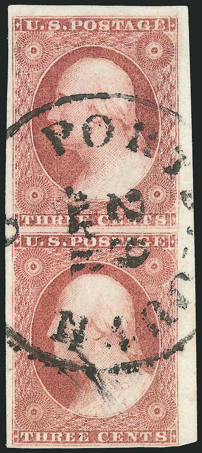 357   Image3c Dull Red, Ty. I (11). Positions 10/20L5L, vertical pair, huge margins to clear including part of top right corner sheet margins, remarkably detailed impression, bold strike of circular datestamp, Extremely Fine Gem, a superb used pair (Image)
