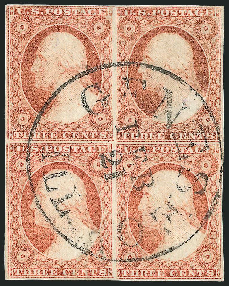 411 bl Image3c Dull Red, Ty. II, "Three Rows" (11A). Positions 89-90/99-100L3, block of four, large margins to full, brilliant color, neat strike of large "Geneseo Ill. Feb. 21" circular datestamp, right stamps with no inner frameline with corner rosettes impinging on outer frameline, light corner crease at top right, Very Fine appearance, a desirable "Three Rows" multiple, the unintentionally wide spacing between the eighth and ninth vertical rows and the narrow spacing between the ninth and tenth vertical rows of the left pane of Plate 3 required special frameline recutting to minimize the visual spacing anomalies (Image)