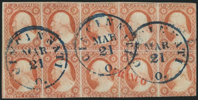 412 bl Image3c Dull Red, Ty. II (11A). Block of ten, huge margins to just in, brilliant color nicely complemented by blue "Cincinnati O. Mar. 21" circular datestamps, also with red "Franco" handstamp, few light creases, Fine-Very Fine appearance, scarce large used multiple, Scott Retail as two blocks of four and a pair (Image)
