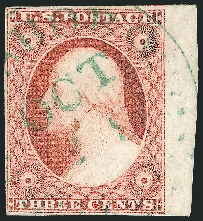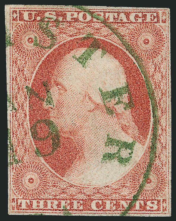 417   Image3c Dull Red, Ty. I, II, Colored Cancels (11-11A). 24 stamps, each with a colored town cancel, including five in green (York Pa., Fairfield N.Y., Rome Ga.), 11 in red, two in purplish-red, three in blue, one in ultramarine and one in violet-blue, one with railroad circular datestamp, attractive full margins with the occasional frameline touched, a few small flaws to be found but overall a high quality and Very Fine group, one P.F. certificate accompanies (Image)