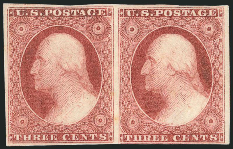 423 og Image3c Claret, Ty. II (11A). Horizontal pair, original gum, lightly hinged, intense shade and impression, few small toned spots on back, Very Fine appearance (Image)