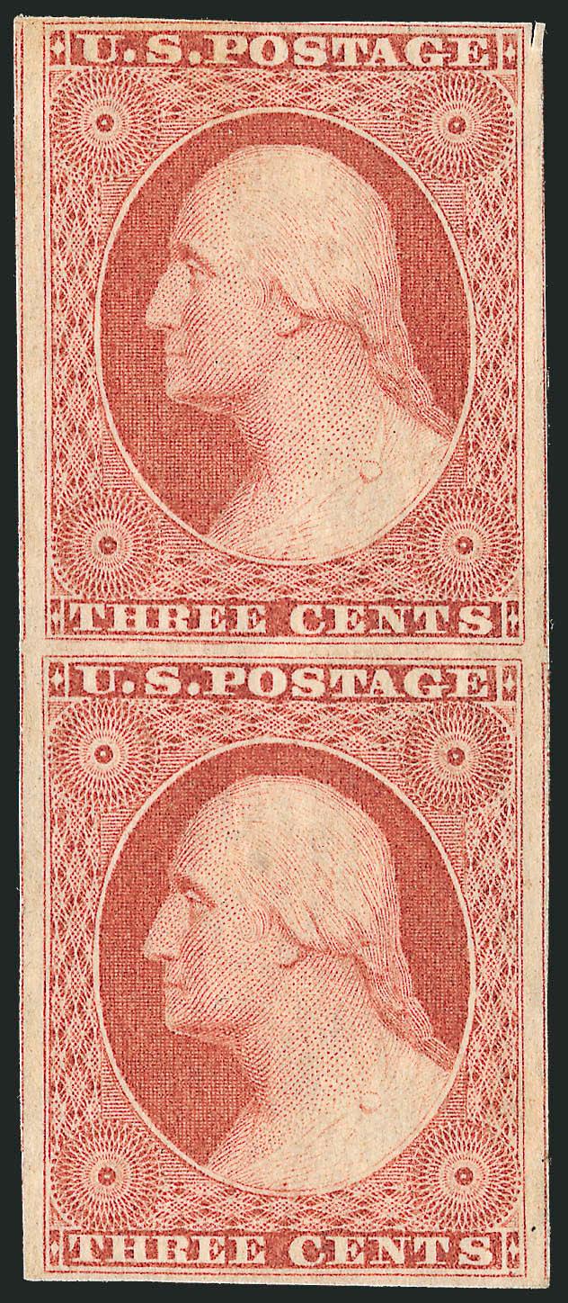 424 og Image3c Claret, Ty. II (11A). Vertical pair, original gum, barely hinged, large margins to clear including part of four adjoining stamps at sides, radiant color, tiny scissors-cut in margin only at upper right, Very Fine (Image)