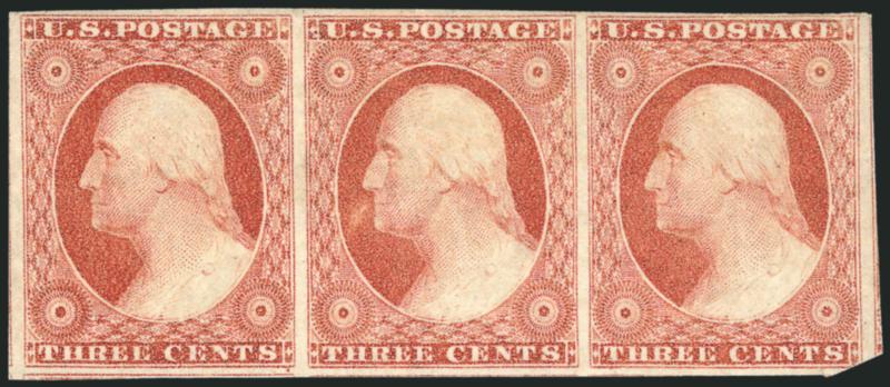 425 og Image3c Claret, Ty. II (11A). Horizontal strip of three, original gum, large margins to just in where bottom right corner slightly clipped, radiant color, fresh and Fine-Very Fine, an attractive original gum strip of three (Image)