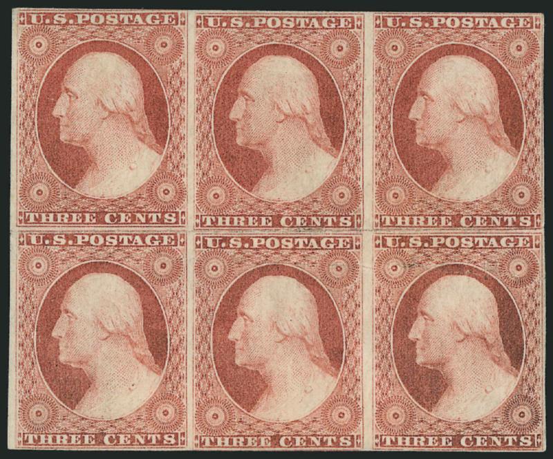 426 og Image3c Claret, Ty. I (11). Block of six formed by two rejoined strips of three, original gum, h.r., rich color, few flaws, Fine appearance, Scott Retail as two strips of three (Image)