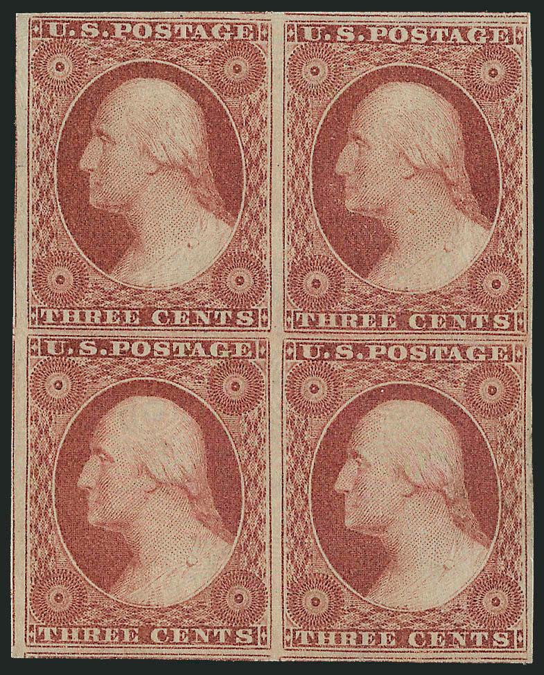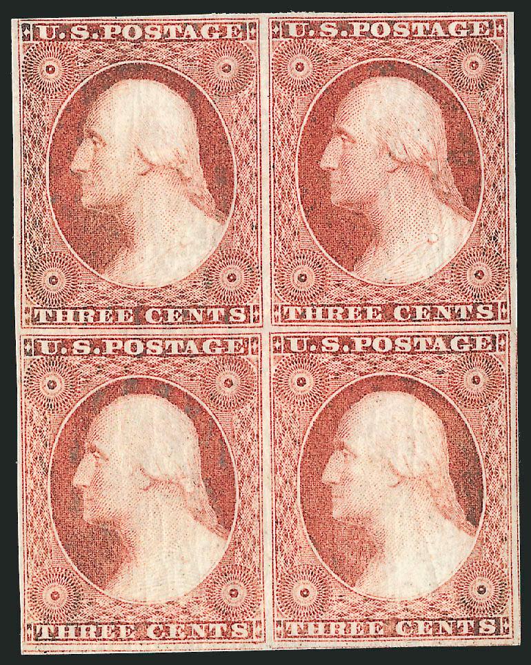 427 ogbl Image3c Claret, Ty. I (11). Block of four, glazed original gum, large margins to clear including part of six adjoining stamps, radiant color, crisp impression, Very Fine (Image)
